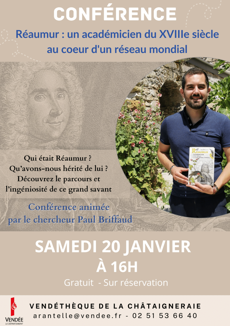 Le chercheur Paul Briffaud vous propose une conférence portant sur Réaumur et sa publication « Réaumur, un académicien du XVIIIè siècle au cœur d’un réseau mondial ». À cette occasion, découvrez le parcours et l’ingéniosité de ce grand savant, mis en avant sur le territoire du Pays de Pouzauges par le Manoir des Sciences.