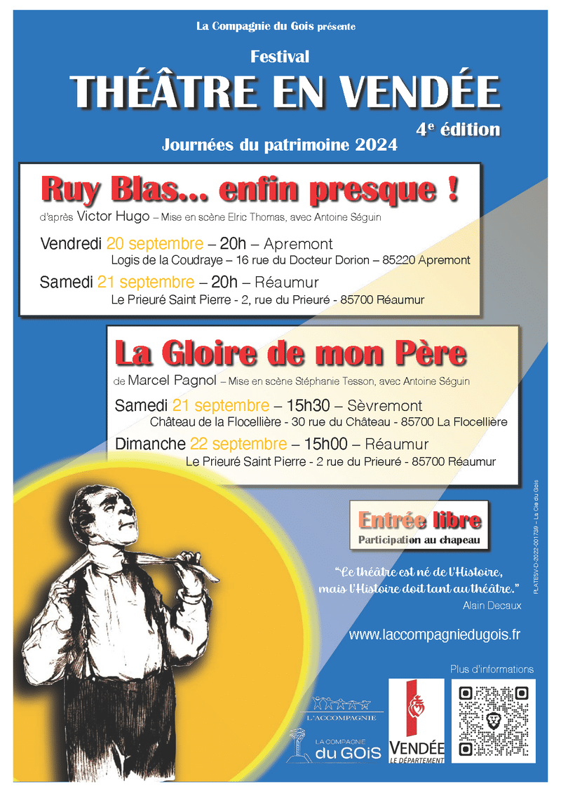 À l’occasion des Journées du Patrimoine, la Cie du Gois propose une représentation de la pièce « La Gloire de mon Père », de Marcel Pagnol, mise en scène de Stéphanie Tesson, avec Antoine Seguin :