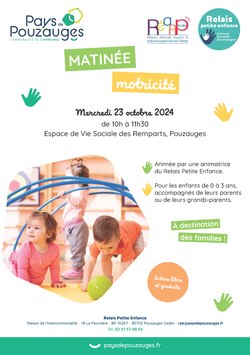 Matinée motricité pour les enfants de 0 à 3 ans, accompagnés de leurs parents ou de leurs grands-parents. Animée par une animatrice du Relais Petite Enfance du Pays de Pouzauges :