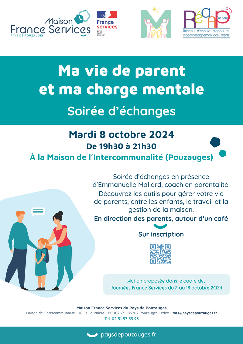 À l’occasion des Journées France Services, la Maison France Services du Pays de Pouzauges organise une soirée d’échanges « Ma vie de parent et ma charge mentale » :