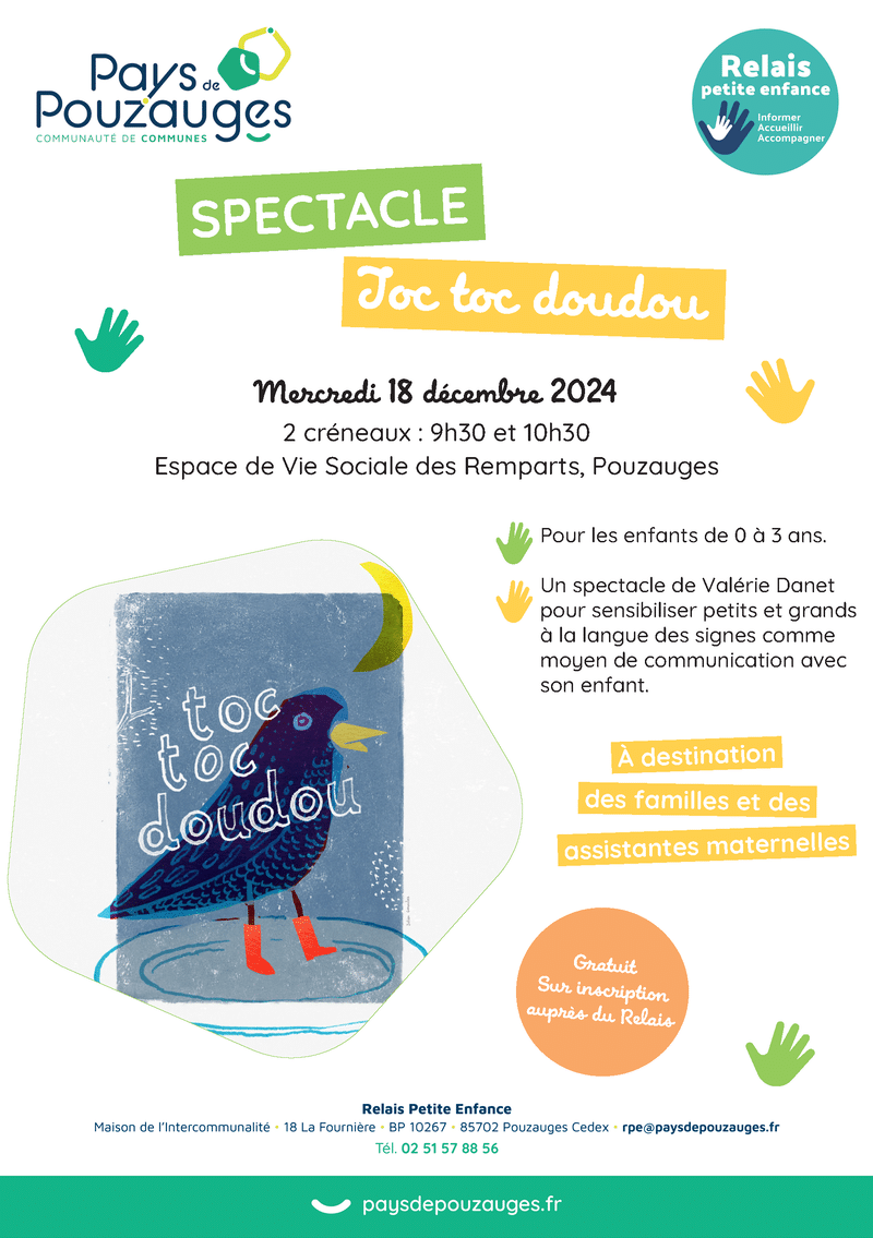 Le Relais Petite Enfance du Pays de Pouzauges vous propose d’assister au spectacle « Toc toc doudou », de Valérie Danet. Un spectacle pour les 0-3 ans, qui sensibilise petits et grands à la langue des signes comme moyen de communication avec son enfant :