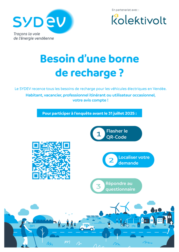 👥 Que vous soyez habitant, vacancier, professionnel ou utilisateur occasionnel, votre avis compte ! Partagez vos besoins pour aider le SYDEV à déployer des bornes là où elles sont nécessaires : près de chez vous, de vos lieux de travail ou de loisirs…
