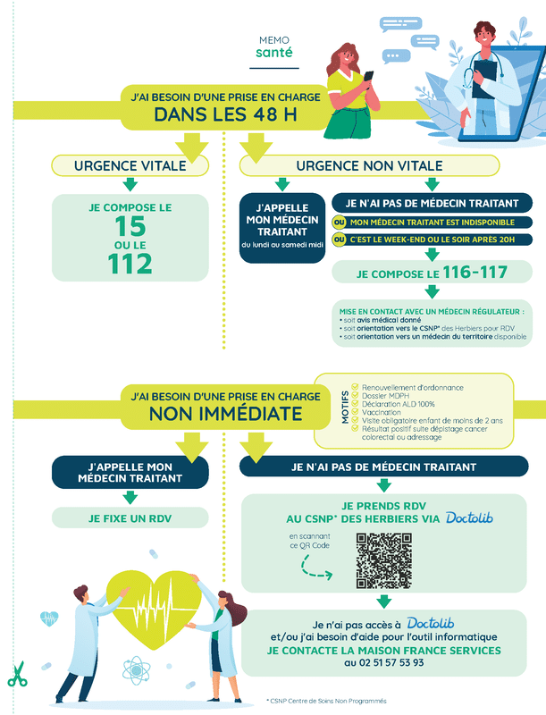 Par le numéro unique de régulation de la médecine générale en Vendée : le 116 117 (pour une prise en charge médicale non vitale), ou bien par l’application ou le site Doctolib (en tapant « centre de soins non programmés des Herbiers »), pour des motifs de consultation bien précis (renouvellement d’ordonnance, vaccination, certificat MDPH, demande de prise en charge des affections de longue durée, visite obligatoire pour un enfant de moins de 6 ans ou résultat positif à la suite d’un dépistage du cancer colorectal).
